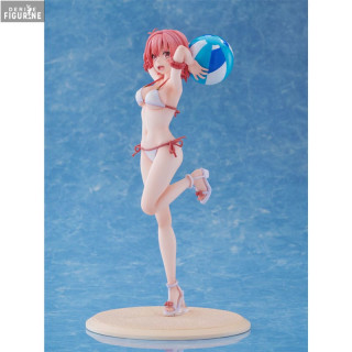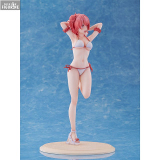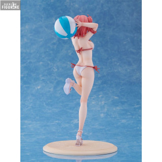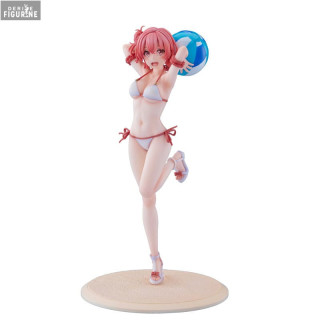 This figure perfectly captures Yui's cheerful and carefree spirit, dressed in a white swimsuit adorned with red bows, emphasizing her natural charm. Holding a beach ball and posed dynamically, this piece evokes a summery atmosphere full of lightness and happiness. The intricate details, such as her tied pink hair and radiant expression, highlight the meticulous craftsmanship behind this creation.