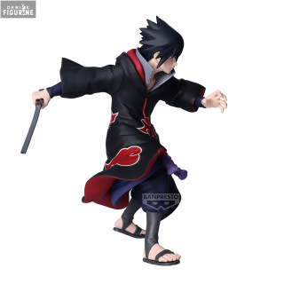 The Vibration Stars Sasuke Uchiha figure by Banpresto captures him in a dynamic pose, ready to draw his sword for battle. His iconic Akatsuki outfit, with the long black coat decorated with red clouds, is faithfully reproduced. The attention to detail, from the folds of his clothing to the determined expression on his face, makes this figure particularly impressive.
