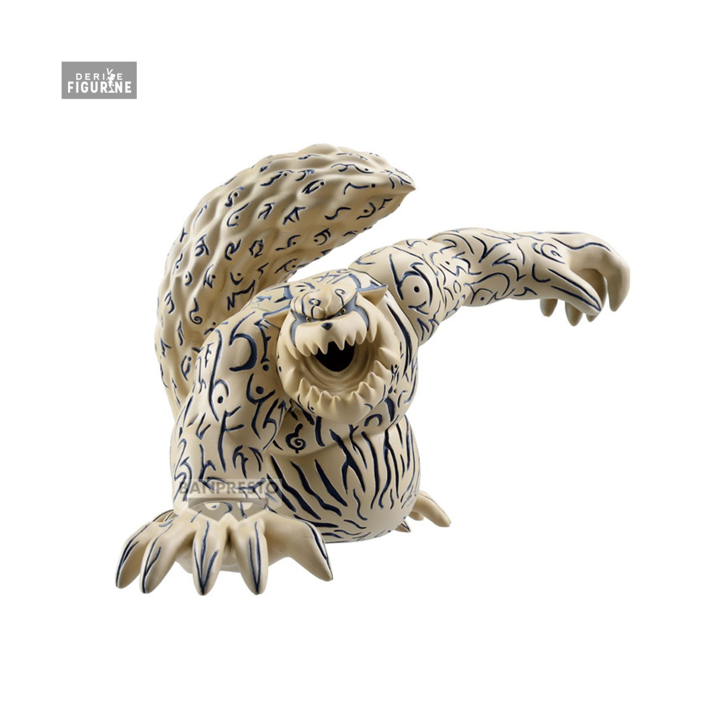This official vinyl figure, part of the Sofubi collection and produced by Banpresto, stands 10 centimeters tall. With a careful finish faithful to his appearance in the anime, Shukaku is depicted in a dynamic pose, ready to pounce with his menacing grin and his massive tail dominating the figure. The meticulously reproduced blue inscriptions across his beige body enhance the authenticity and uniqueness of this piece. A must-have figure for all Naruto Shippuden fans, celebrating Shukaku's colossal power in a compact and elegant format.