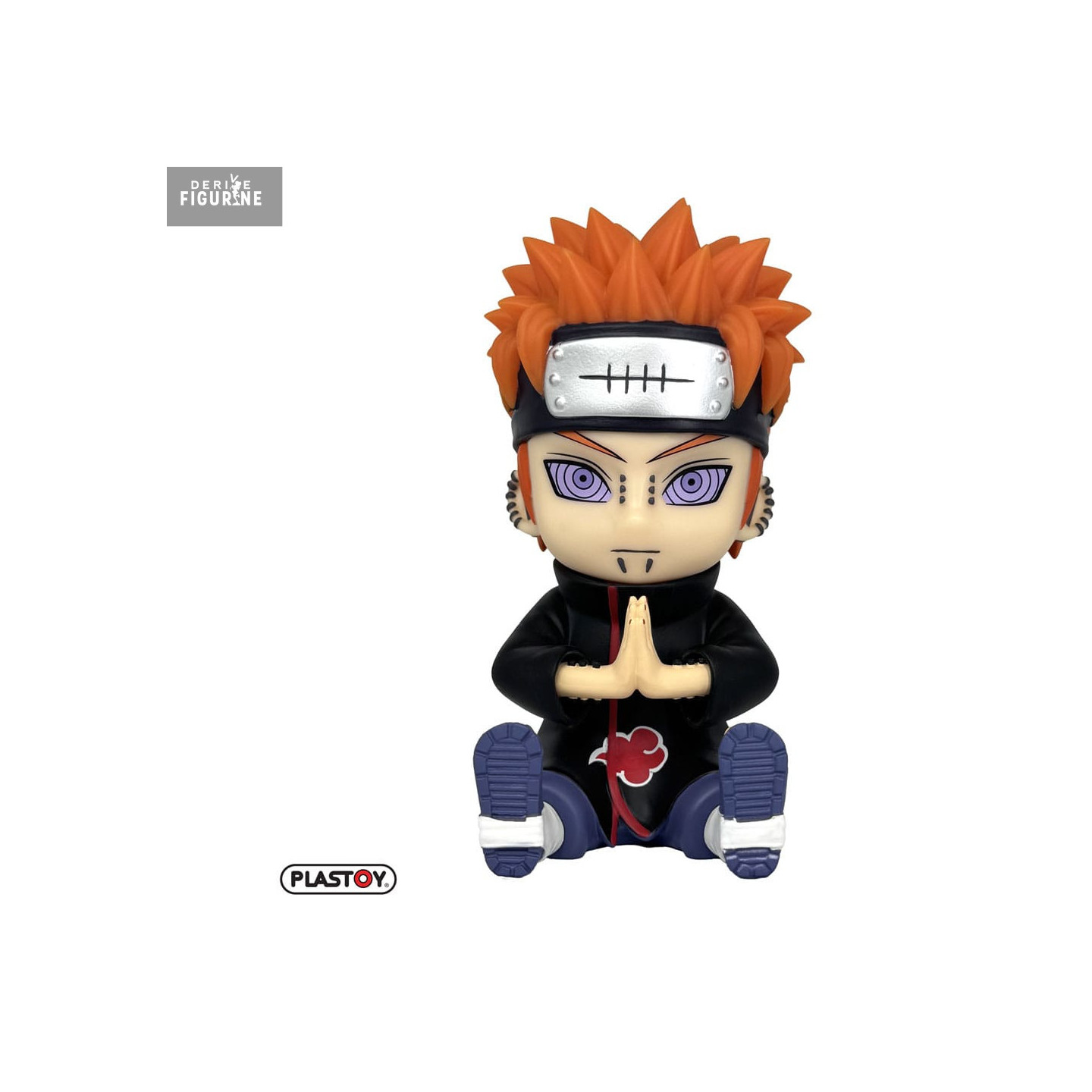The figure depicts him seated, wearing the long black Akatsuki cloak adorned with red clouds. His spiky orange hair frames a scratched metal forehead protector, symbolizing his break from his home village. His purple, concentric-ringed eyes faithfully recreate the Rinnegan. His hands are clasped in a hand sign, and the facial piercings are carefully detailed.