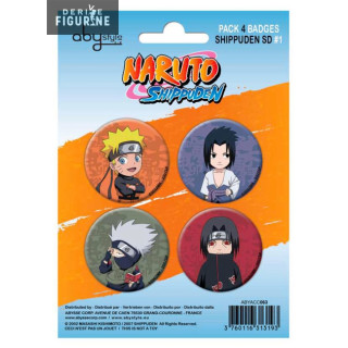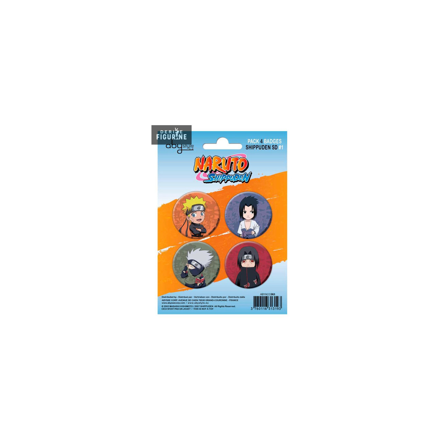 Naruto Shippuden badges that are about 4 centimeters in diameter and have a safety pin on the back to attach them. The manufacturer is ABYstyle.