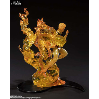 Leaping forward, Naruto is surrounded by translucent golden flames forming the fierce silhouette of Kurama, the Nine-Tailed Fox. Every flame, every detail of his pose and outfit is sculpted to perfection, creating a dynamic, explosive moment frozen in time.