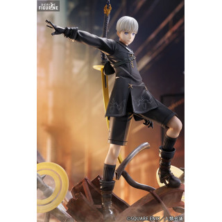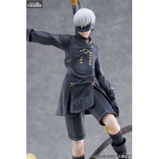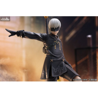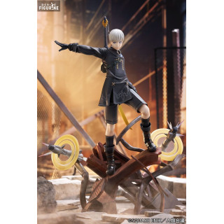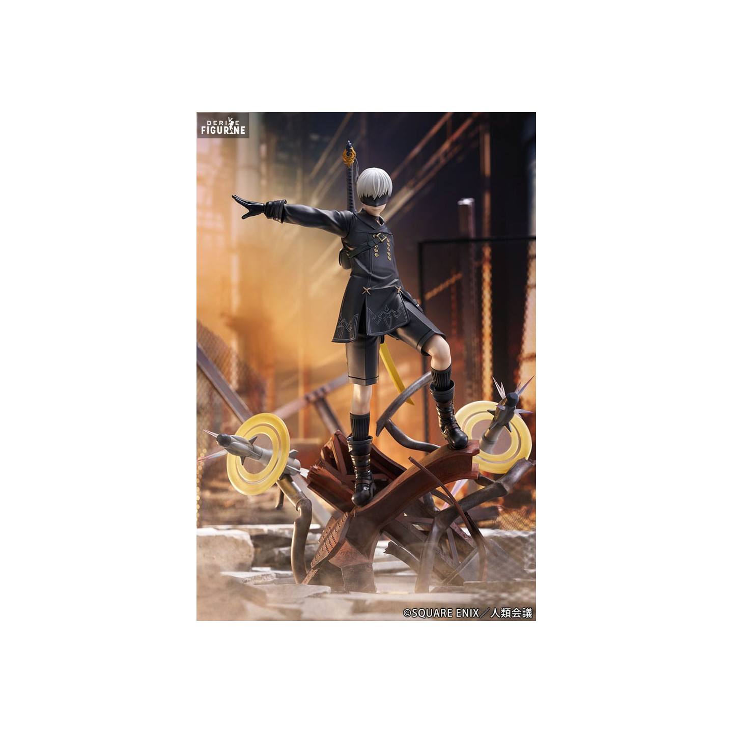 Every detail of this figure has been carefully sculpted to capture the complexity and beauty of 9S's design. Elements of her black outfit, with its intricate patterns and distinctive accessories, are faithfully reproduced. The texture of his clothing, the precision of the details on his boots and headband, and the fineness of his weapon are all done with great precision. The figure's base, featuring metallic debris and futuristic scenery elements, adds an extra dimension and reinforces the game's immersive atmosphere.