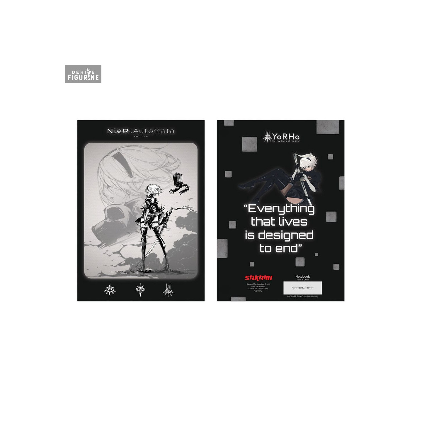 Official notebook A5 of NieR: Automata Ver. 1.1a measuring approximately 14.5 x 21 centimeters. The manufacturer is Sakami.
