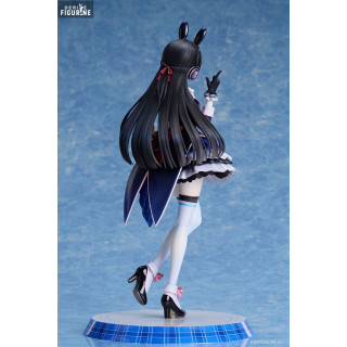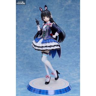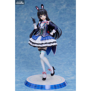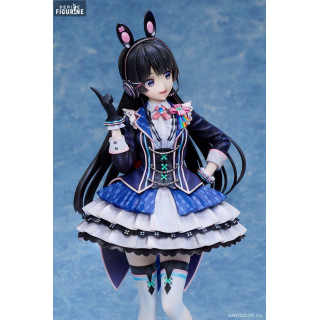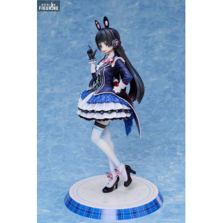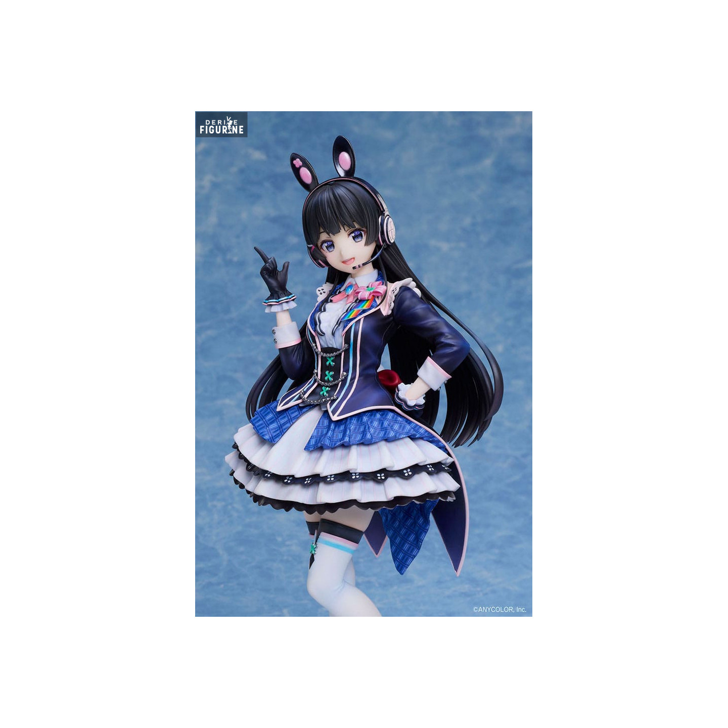 The figure depicts Tsukino Mito in an elaborate outfit, inspired by her virtual avatar. She wears an elegant and stylish dress, made up of multiple layers of ruffled skirts and a detailed top. The bright and harmonious colors, mixing shades of blue, pink and white, bring a touch of freshness and modernity to the whole. Accessories, such as the bunny ears on his helmet, add a fun and unique touch, true to his original design.