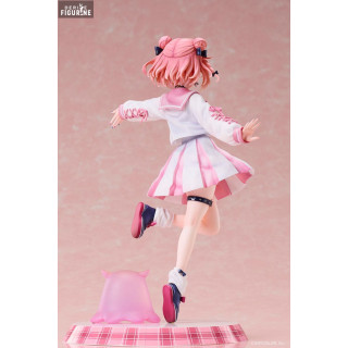 The figurine shows Sasaki Saku in a happy and energetic pose, with a wide smile that reflects his radiant personality. She wears a pink and white school uniform, adorned with lots of little details like ribbons and adorable accessories, which add a touch of whimsy to the whole look. Her pink hair is intricately sculpted, with strands that move with her movement, capturing the essence of her animated design.