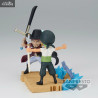 Official figure of Roronoa Zoro vs Dracule Mihawk in PVC which measures approximately 7 centimeters high. It is from the WCF Log Stories collection. The manufacturer is Banpresto.