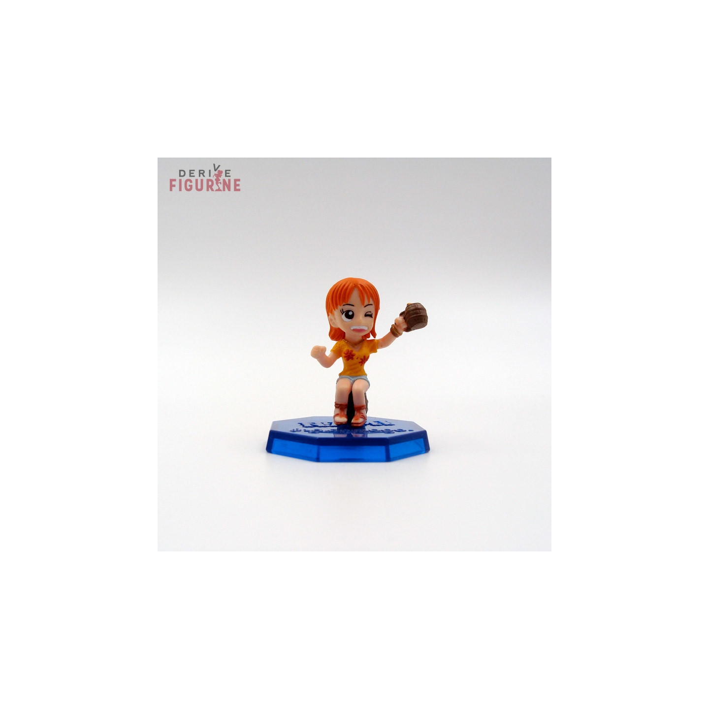 Second-hand and official Nami figure in PVC about 4 centimeters high. Glass in the air, Nami toast to your health. This is a second-hand item in perfect condition from the Landing Sabaody! Archipelago! collection. The manufacturer is Bandai, sold without box and without the card.