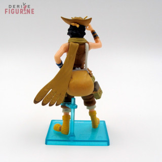 Second-hand and official Usopp figure in ABS/PVC about 11 centimeters high. Usopp looks ready for a new adventure. This is a second-hand item in perfect condition from the Unlimited Cruise collection, but the attachment is weakened. The manufacturer is Bandai, sold with box in fairly good condition.