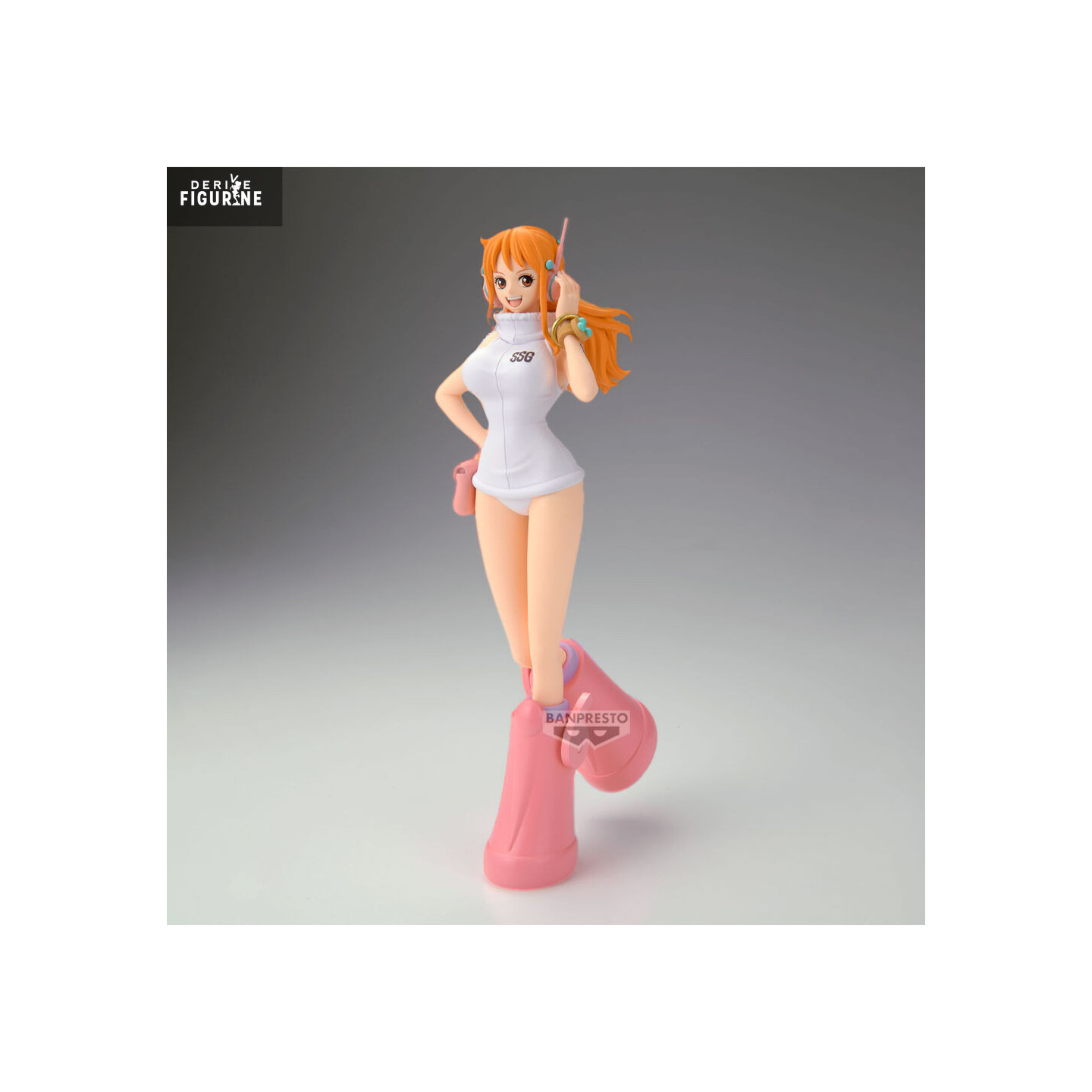 This 23 cm PVC figure from Banpresto’s Glitter & Glamours line showcases her Egghead outfit: a sleeveless turtleneck top emblazoned with the SSG insignia, sleek shorts, and signature oversized pink boots that lend her a playful, modern flair. Stylized bracelets adorn her wrist, and the high-tech headphones—adjusted in mid-gesture—underscore her role as a futuristic cartographer.