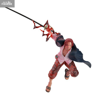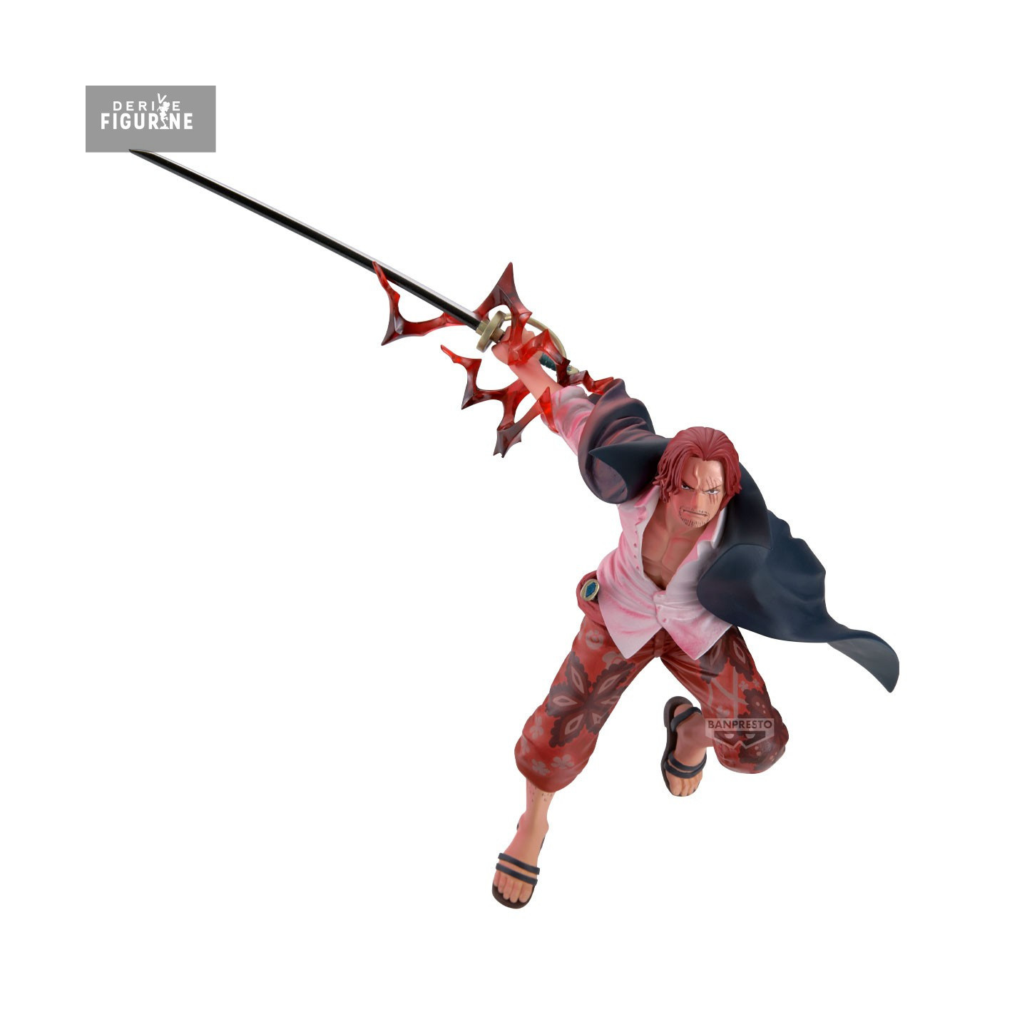 This figure captures him in mid-action: sword raised, coat billowing behind, Shanks assumes an aggressive stance. His open white shirt, red patterned trousers, and sandals bring his iconic look to life. The determined expression and sculpted red hair emphasize the moment’s intensity.