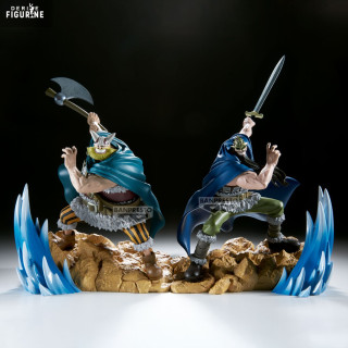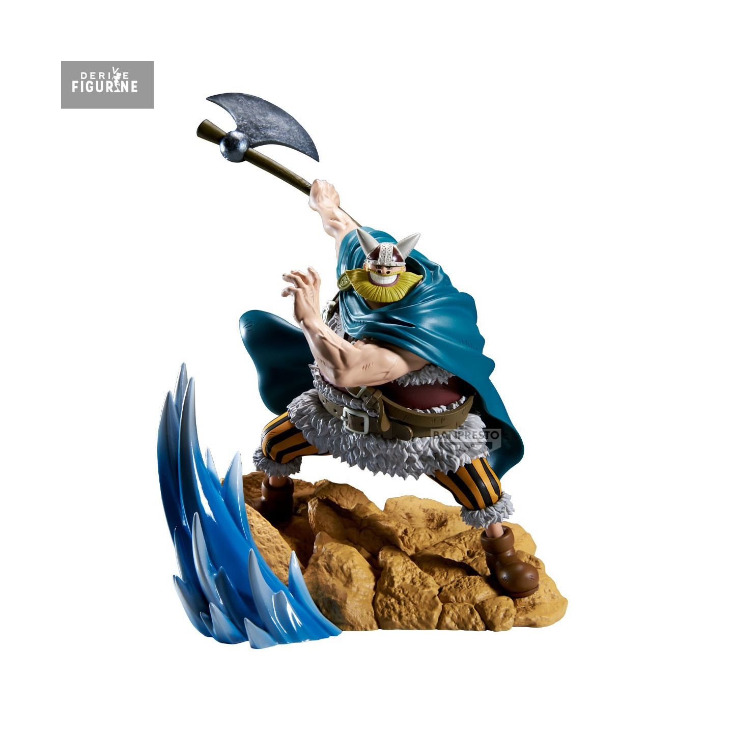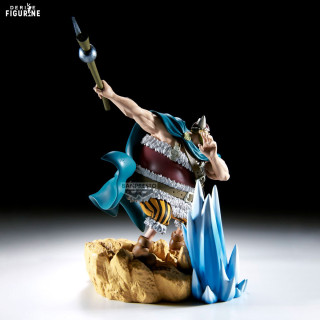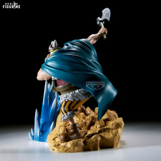 Made of high-quality PVC, this 18 cm-tall piece stands out for its meticulous finishes: the sculpted rocky base and translucent blue wave effect convey the battle’s energy, the garment folds and fur details are precisely rendered, and the matte paint accents the material contrasts.