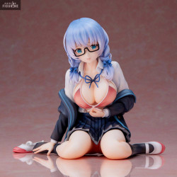 The young woman you see is from an illustration by Yuyu Ichino. She bears the name of Boku no Class no Gakkyuuiin-san and therefore represents a young lady with very pretty blue hair. She is wearing a schoolgirl outfit, although she took off a shoe and took off her top to feel comfortable.