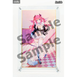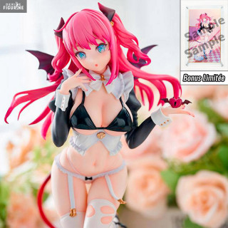 The figure stands on a round pink-and-white checkered base, reminiscent of a sugary lounge or fantasy cabaret stage. Her dynamic pose—leaning slightly with one hand raised to her lips and the other reaching out—enhances her flirty, playful vibe. Every detail, from her ruffled skirt to the bat wings and golden garters, is expertly sculpted. As a bonus, this limited edition includes a framed illustration print by Mimosa, making it a perfect display centerpiece.