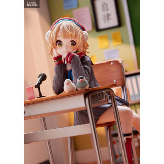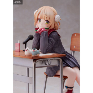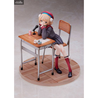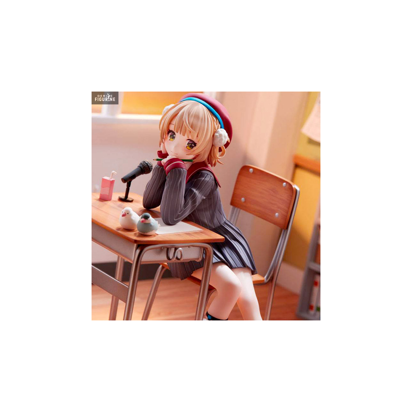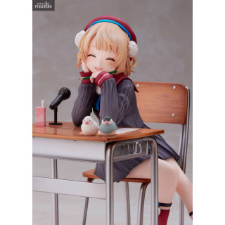 Shigure Ui is a young woman who posts many videos on YouTube and she has many fans since they are more than 757 thousand subscribers on her channel. Here, she's sitting in front of her desk with a microphone, two little birds to decorate her with, and a carton of fruit juice. She is looking for inspiration because she is in front of a white sheet and a pencil in her hand. She has a spare smiley face and you can also take her beret off if you want.