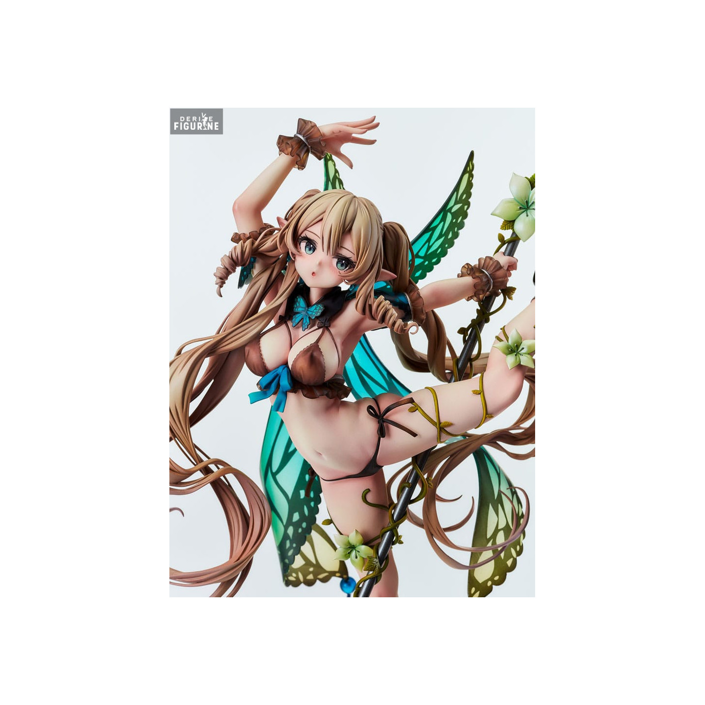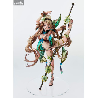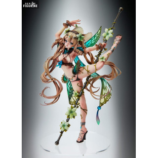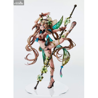 Ulysses, the ninth villager of Elf Village, is depicted in a dynamic and graceful pose, holding a spear decorated with flowers. Her translucent wings in green and blue hues add a touch of magic to the whole, while her long brown hair, adorned with flowers, falls in elegant curls. Its light outfit, composed of leaves and vines, underlines its close connection with nature.