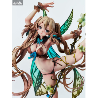 Ulysses, the ninth villager of Elf Village, is depicted in a dynamic and graceful pose, holding a spear decorated with flowers. Her translucent wings in green and blue hues add a touch of magic to the whole, while her long brown hair, adorned with flowers, falls in elegant curls. Its light outfit, composed of leaves and vines, underlines its close connection with nature.