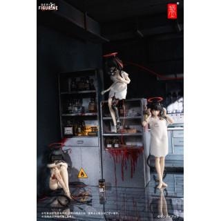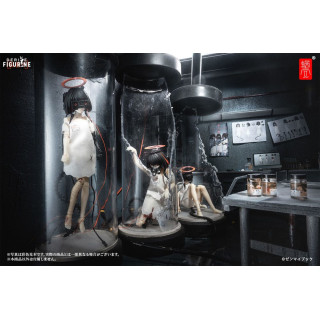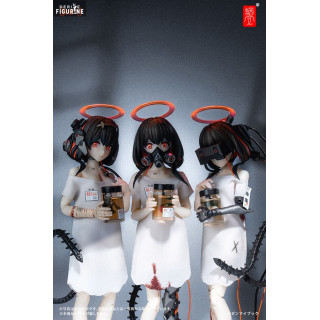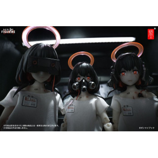 The See no Evil figurine represents an androgynous character with human and mechanical characteristics. Featuring an orange glowing halo, this figurine evokes an aura of mystery and futuristic technology. Dressed in a simple white dress, the contrast between the innocence of her outfit and the mechanical elements of her body underlines the theme of the fusion between human and machine.