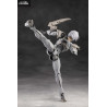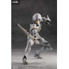The sculpt highlights every piece of her gear: angular ornamental pauldrons, a stylized ribcage breastplate, and articulated greaves designed for both agility and durability. Her silver hair, sculpted in dynamic strands, contrasts strikingly with the raw gray armor. As a Plastic Model Kit, this military prototype assembles without glue via snap-fit ABS and PS parts onto an internal polycap frame.