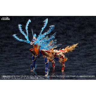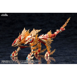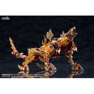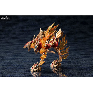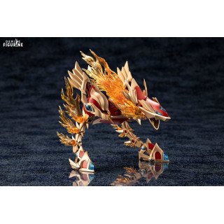 This Kotobukiya plastic model kit assembles deep red and metallic-gold plates adorned with amber transparent flame effects. Her hind limbs, poised for a leap, and runic wings sculpted in relief create a stunning aerial dynamic. Azure gems set within her armor contrast with the vibrant flames, while intricate rune engravings on every plate add refined detail.