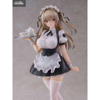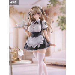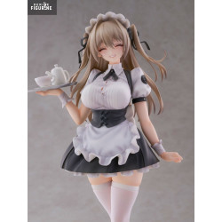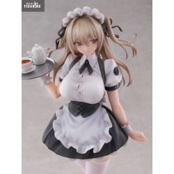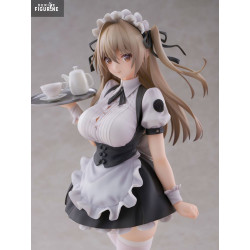 The figure shows her standing gracefully, dressed in a classic maid uniform: black dress with fitted white apron, cinched corset, and puffed sleeves adorned with a black bow. White thigh-high stockings and black heels complete this iconic look. A delicately sculpted tea tray, including a teapot and cup, enhances the scene.