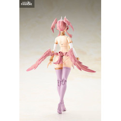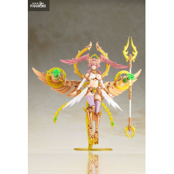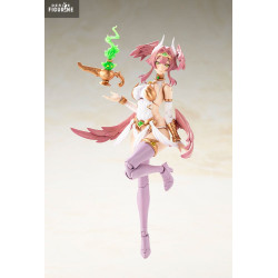 Her costume features a mix of white and gold, accented with soft pink and emerald green elements that complement her hair and feathered wings. Tall lavender boots, embedded gems, and segmented wing parts add complexity and depth, characteristic of self-assembled model kits. The visual style reflects the mecha-fantasy anime aesthetic of the Arcanadea line.