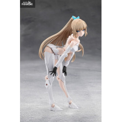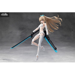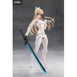 Her design features a minimalist white armor with clean contours, articulated joints, and subtle mechanical details. The large black sword with its vivid blue edge adds bold contrast and a cutting-edge look. Everything about her sculpt communicates control, elegance, and lethal focus.