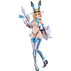 What you see is a mostly white, minimalist outfit with turquoise blue accents and small black details, paired with long matching legwear and darker footwear. She has blonde hair, bright blue eyes, and tinted goggles resting on top of her head, plus a large blue-and-black “ear” style headpiece. She comes holding a large futuristic white-and-turquoise weapon, and the accessory layout shows multiple optional hands, several face plates with different expressions, extra equipment pieces, and a stand/support arm to help you build varied shelf scenes.