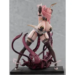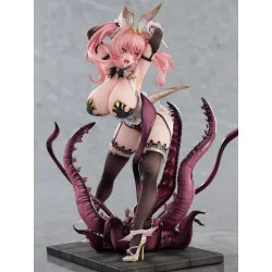 Visually, she’s sculpted leaning forward with a deep arch, both arms raised behind her head. Her pink hair is styled into wavy twin ponytails, topped with large bunny ears, and she wears a black-and-light bunny suit with gold accents, black gloves, and dark thigh-highs held by strap-like details with a lace-style edge at the top. She’s in high heels with light decorative pieces around the ankles, and everything stands on a square black tiled base where thick, textured purple tendrils curl up around her legs and rise behind her; with that backdrop, it naturally becomes a strong centerpiece on the shelf.