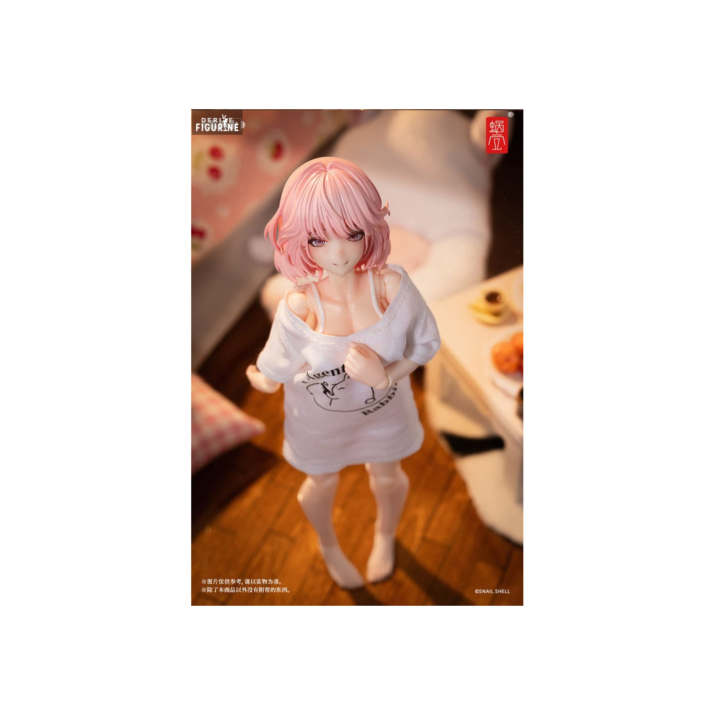 Discover RA-01L Aileen, an ultra-detailed articulated figure, part of the Original Character lineup created by Snail Shell. Aileen stands out with her beautifully crafted and realistic design, featuring a relaxed loungewear style perfect for moments of leisure. With her soft pink hair, delicate expression, and oversized casual t-shirt, she exudes an adorable and serene charm. Her modular outfit and various accessories allow for a wide range of display possibilities.