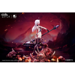 The figure exudes a supernatural aura, highlighted by the distinctive horns adorning her flowing white hair and the imposing staff she wields, topped with a luminous flower in mysterious hues. Her partially corrupted right arm and the skull she holds add a dramatic dimension, hinting at a deeply rooted mystical power or enigmatic backstory. Every element of this piece evokes a fantastical universe where elegance meets darkness.