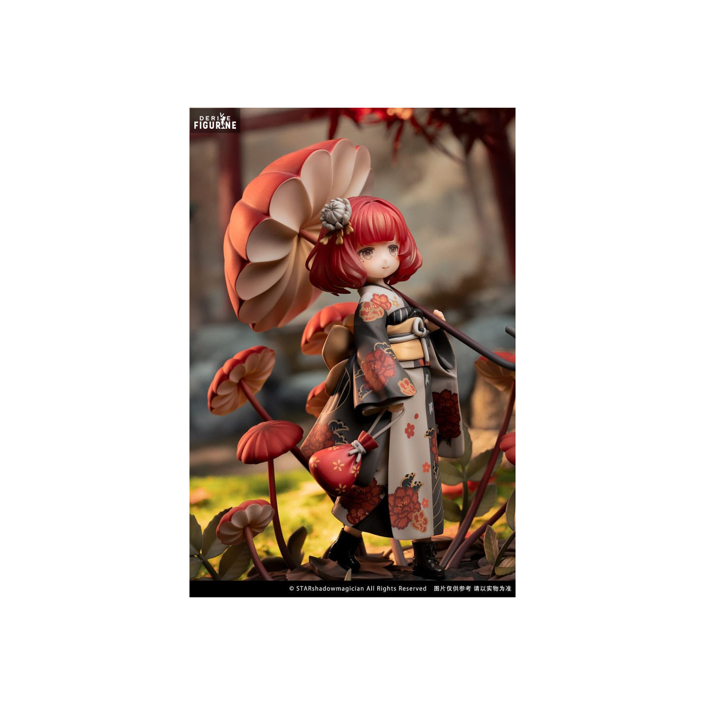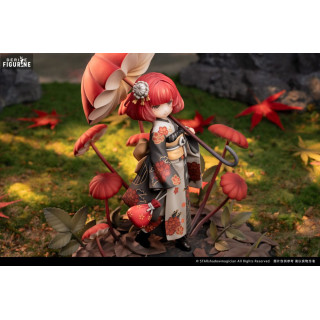 Her design draws inspiration from the Marasmius Haematocephalus, a rare red-tinted mushroom found in humid forest environments. This essence of nature is intricately woven into her figure, with mushroom-shaped accessories and ornaments seamlessly blending into her attire. Her large mushroom-like headdress, delicate kimono patterns, and surrounding flora create the impression of a creature deeply connected to the forest, a spirit of nature embodied in human form.