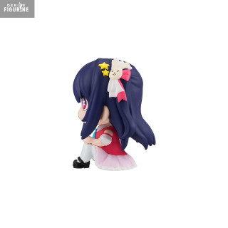 This Look Up Series figure shows Ai seated with hands clasped on her knees, starry eyes and a soft, thoughtful smile. She wears her signature idol outfit: a coral-pink ruffled dress, turquoise bow, and glossy ballet flats. A cloud-shaped headband with a small pearl brooch echoes her gentle charm.