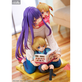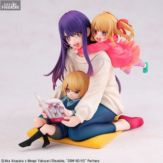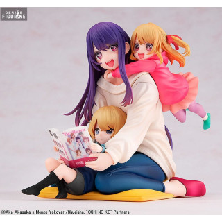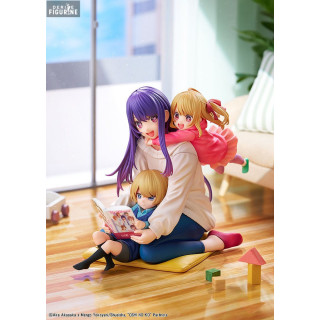 This figurine captures a tender moment between Ai Hoshino and her two children, Aqua and Ruby. Ai, the famous idol, is depicted in a seated pose, surrounded by her children, creating a scene of daily life filled with love and complicity. Aqua, sitting on his lap, is focused on a magazine while Ruby, full of energy, clings to his back. The characters' happy expressions and bright eyes perfectly reflect the affection and joy shared between them.