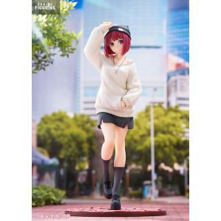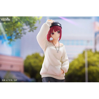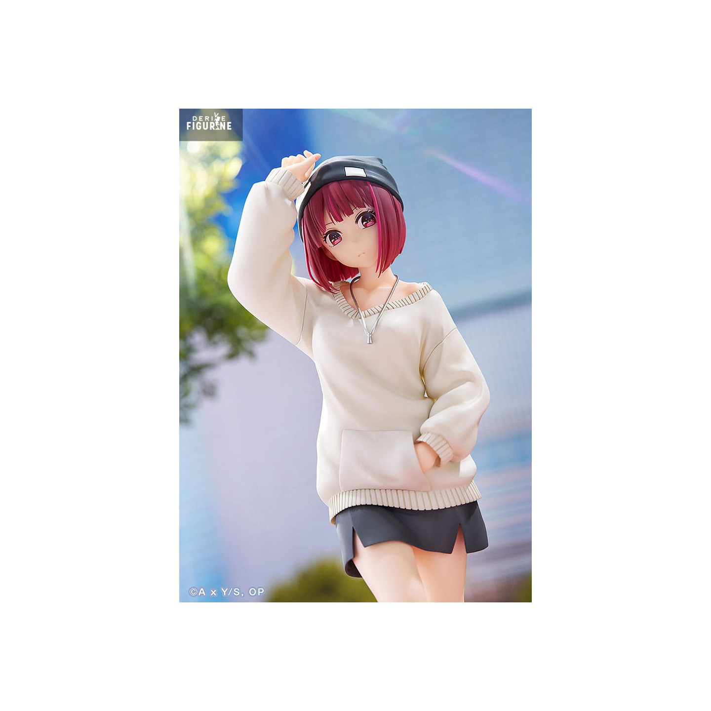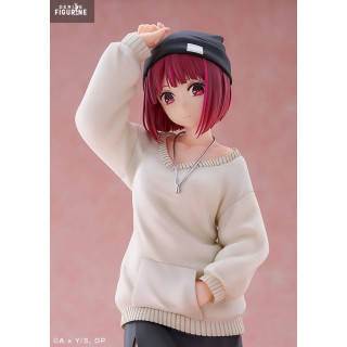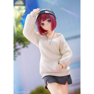 Kana Arima, known for her maturity and professionalism despite her young age, is a well-established actress in the Oshi no Ko universe. This figure depicts her in a relaxed pose, wearing an oversized light-colored sweater, a black skirt, and knee-high socks, while adjusting a black beanie on her head. Her outfit, combining simplicity with elegance, reflects Kana's down-to-earth nature, which hides a deep passion for acting. The subtle details, such as the folds of her sweater and the soft yet determined expression on her face, highlight the quality of the sculpt and paintwork.