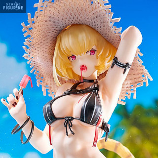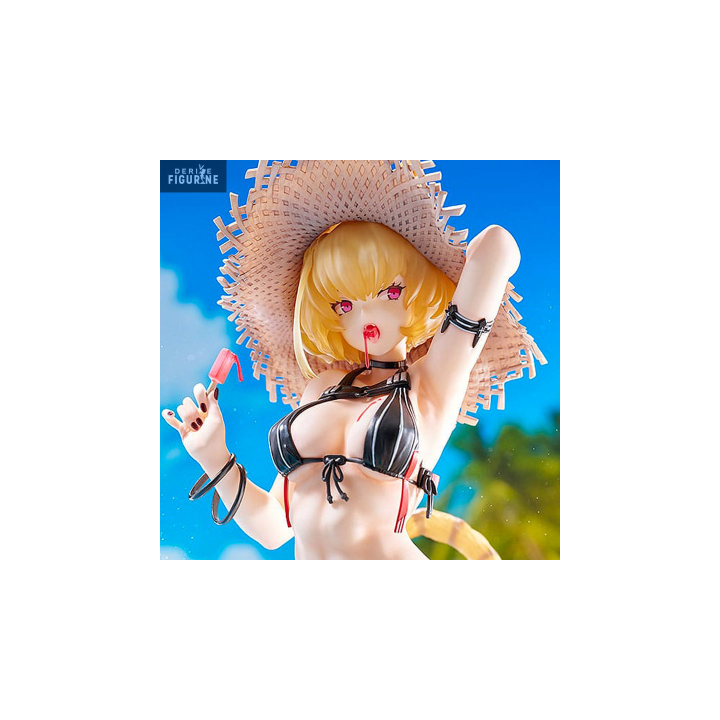 Imagine Clémentine in a rather unusual moment of relaxation, dressed in a swimsuit, wearing a straw hat. She enjoys an ice cream, but what catches the eye is the blood-colored ice cream flowing from her mouth and onto her pale skin. This bold depiction embodies the duality of her character, combining beauty with a sinister aura.