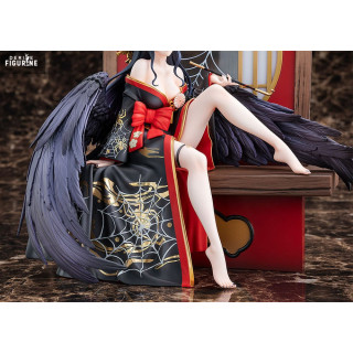 Albedo, the chief guardian of the Great Tomb of Nazarick, is depicted here in a stunning black kimono adorned with golden spider web patterns, highlighting her sophisticated and mysterious nature. The kimono's design, rich in details and intricate finishes, is complemented by a large red bow at the waist, providing a beautiful contrast to the dark tones of the outfit. Her long black wings, sculpted with remarkable precision, spread out majestically around her, enhancing her imposing and divine presence.