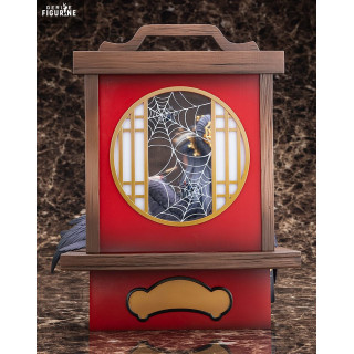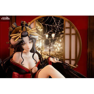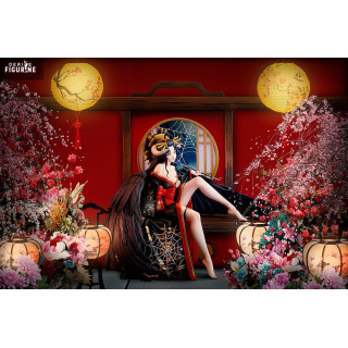 The figure also features an original scene, with Albedo elegantly seated on a traditional bench, leaning against a red folding screen decorated with a spider web, enhancing the character's mystical atmosphere. Albedo’s finely sculpted face exudes a cold, seductive beauty, with her golden gaze captivating the observer. The attention to detail, such as her elaborate hairstyle and golden ornaments, showcases the craftsmanship of Kadokawa.