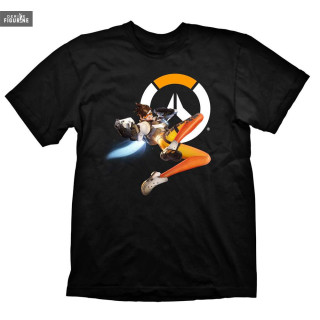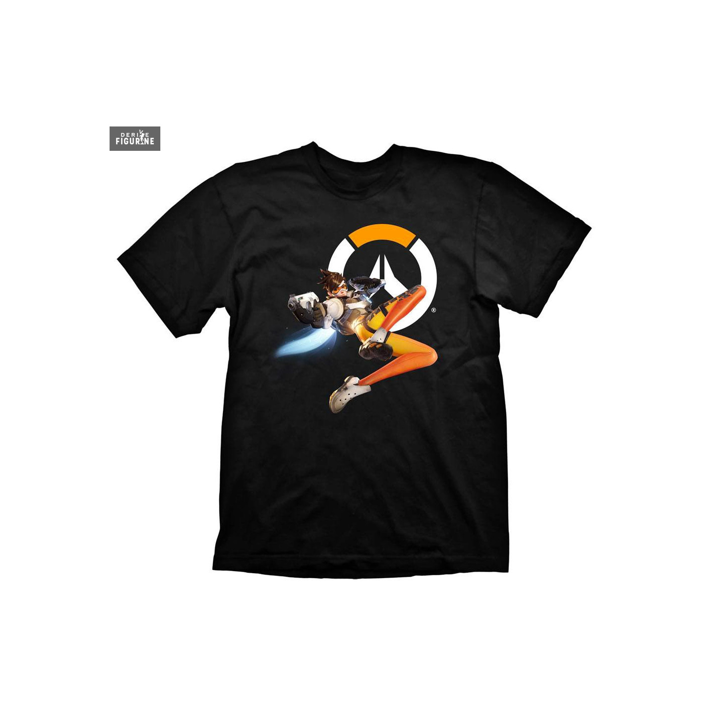 This black t-shirt features Tracer, one of the heroines of the game Overwatch. She is in full jump and behind her, we can see the logo of the game.