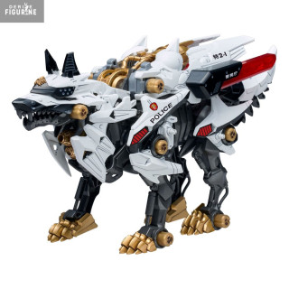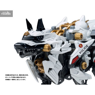 The design is based on a wolf in a poised, aggressive stance: low snout, muscular limbs, and a tense frame. Its black and white body features “POLICE” markings and technical numbering, emphasizing its law-enforcement aesthetic. Gold accents on the claws, joints, and integrated weaponry add a sleek, metallic contrast.
