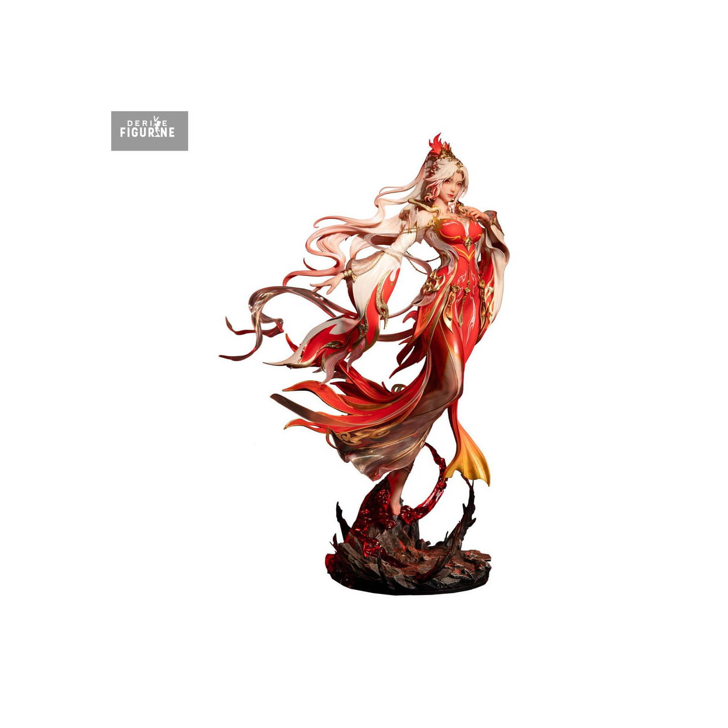 Depicted in a majestic pose, Huo Ling'er wears a lavish red gown adorned with golden flame-inspired patterns that appear to dance around her. The fluidity and movement of her outfit are masterfully captured, creating the illusion that every fabric and accessory is swept by a fiery breeze. Her flowing silver hair elegantly contrasts with the vibrant red and gold tones of her ensemble, while her serene and confident expression, enhanced by delicate facial details and refined finishes, adds to her legendary presence.