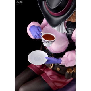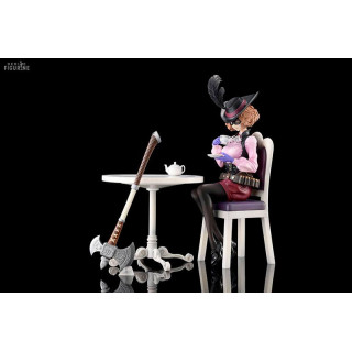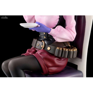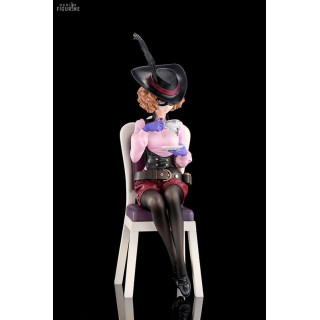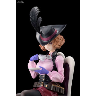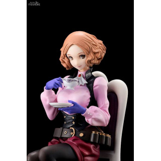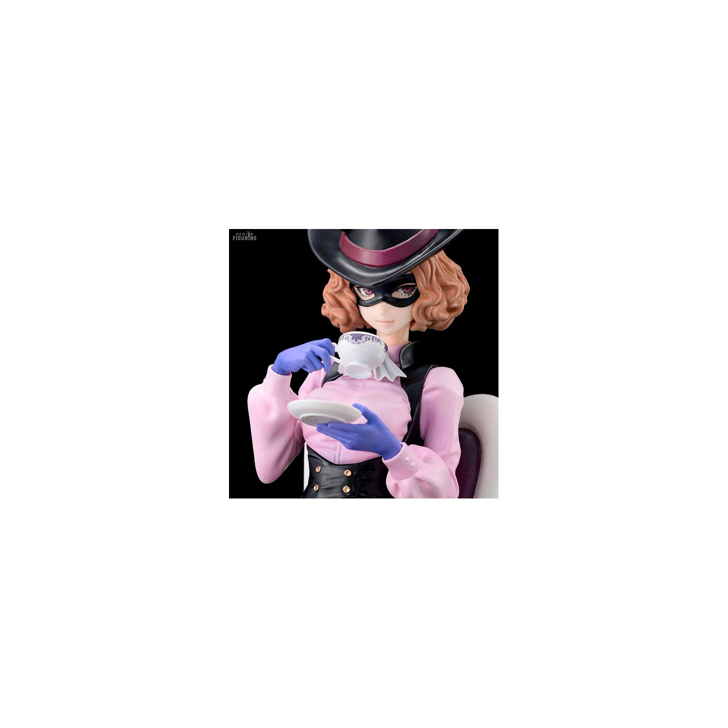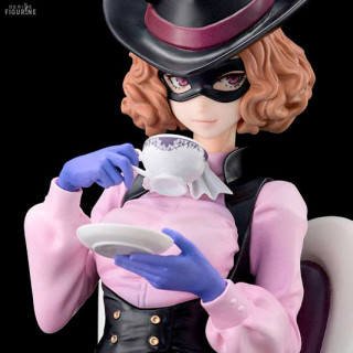 Despite her mask and hat on her head, her curly hair betrays her and lets us guess that it is Haru Okumura. She studies at Shujin Academy, but when she wears this outfit, the naive girl gives way to Noir, one of the members of the Phantom Thieves. She takes the time to drink a cup of tea, her weapon resting on the table, and know that if you wish, you can remove her mask and her hat.