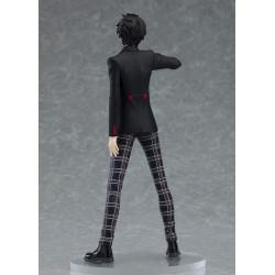 The piece shows him in his iconic black school jacket, slim and buttoned with a line of red buttons, featuring the Shujin Academy crest on the chest. He wears fitted plaid trousers in black with red and grey lines, gathered slightly at the ankles, along with simple black shoes. His tousled black hair frames his face, paired with a serious, focused expression. With legs spread in a steady stance and one arm raised, the silhouette looks sleek and dynamic, making him an easy centerpiece for any Persona display.