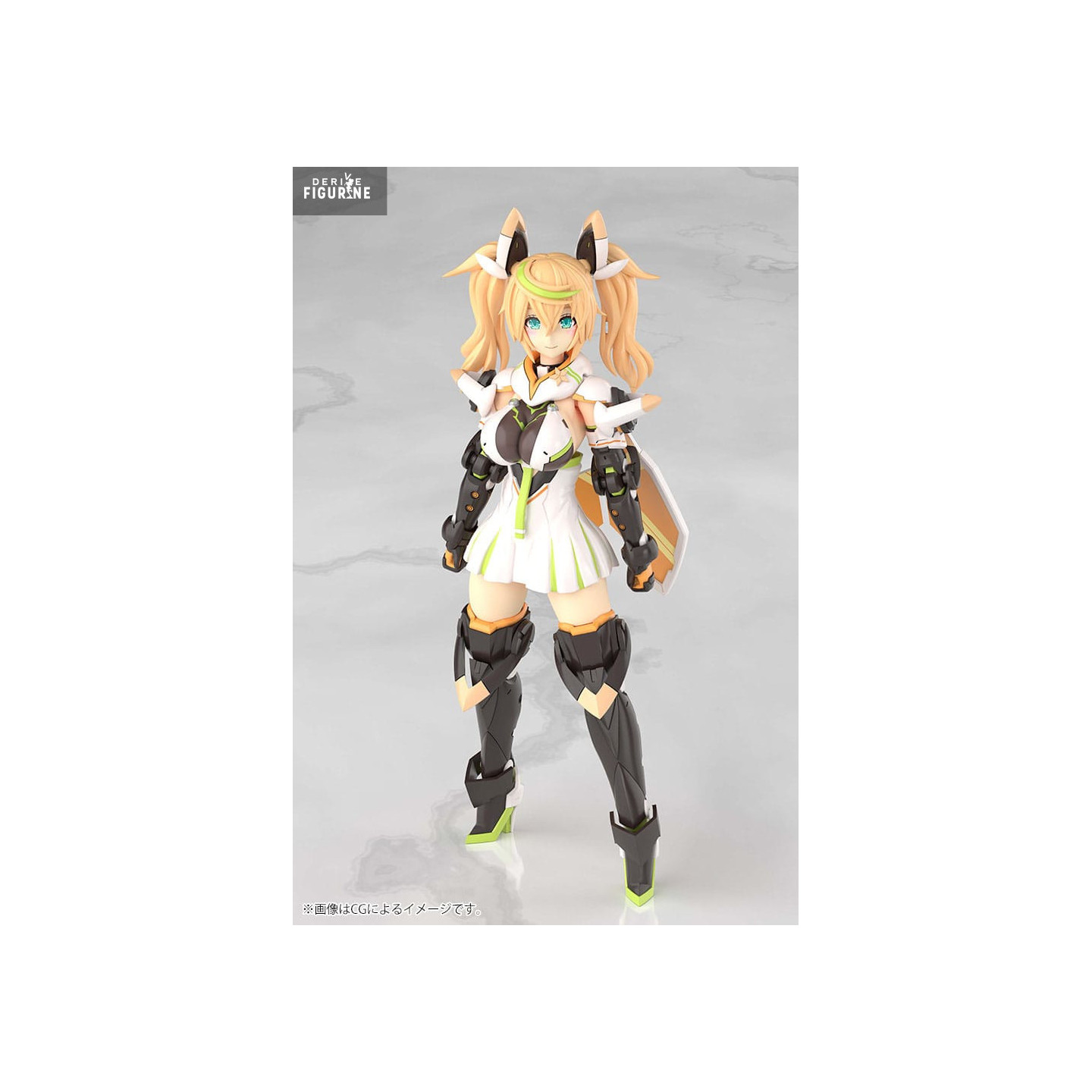 Her outfit mixes crisp white with neon green accents: a short pleated skirt, structured top, articulated mechanical boots, and reinforced forearms. High-tech details such as her large orange shield, animal-like ears, and exposed joint parts enhance her hybrid look—part humanoid, part android.