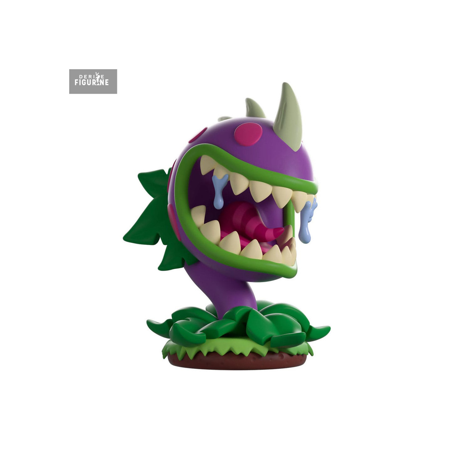 This vinyl figure captures its wild look: a huge purple head with green edging, two big gray horns on top, and a wide-open mouth full of sharp white teeth. Blue drool drips from its fangs, highlighting its hunger. A curled pink tongue sits inside the mouth. It’s rooted in a leafy green base, true to the game’s art style.