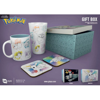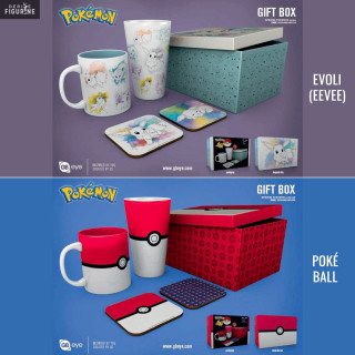 Official gift box Pokémon Eevee Evolutions or Poké Ball with one glass (50 cl), one mug (30 cl) and two coasters. The manufacturer is GB Eye.