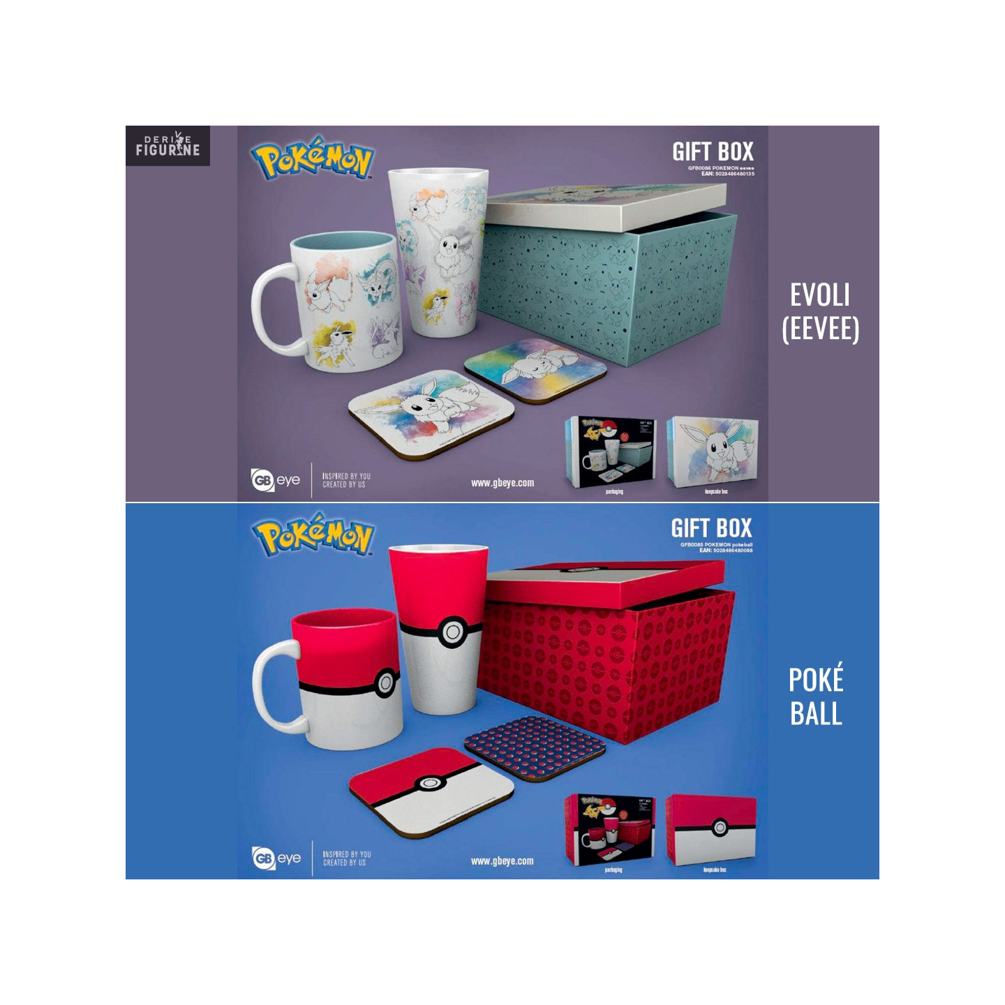 Two Pokémon gift boxes of your choice with on one side, products in the colors of Pokémon Eevee and its Aquali, Pyroli and Voltali evolutions, on the other, it is a pack that carries the colors of the iconic Poké Ball and more known to all. For the two boxes, the content is the same and you will have a glass, a mug and two coasters.