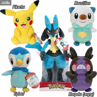 Official plush of your choice between Pikachu, Oshawott, Piplup, Morpeko (angry) which measures approximately 20 centimeters high or Lucario which measures approximately 30 centimeters high. The manufacturer is BOTI.