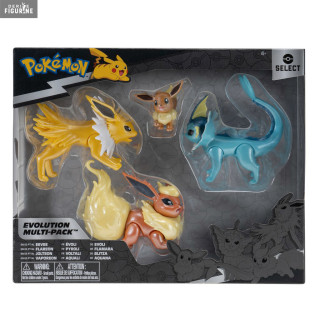 Pokémon is entitled to a figurine pack including some of the Eevee evolutions which are certainly the best known for the Select Evolution Multipack collection. You will find in this pack the cute Eevee and then Eevee, Voltali, Aquali and Pyroli that it becomes when the trainer uses lightning, water and fire evolution stones respectively.