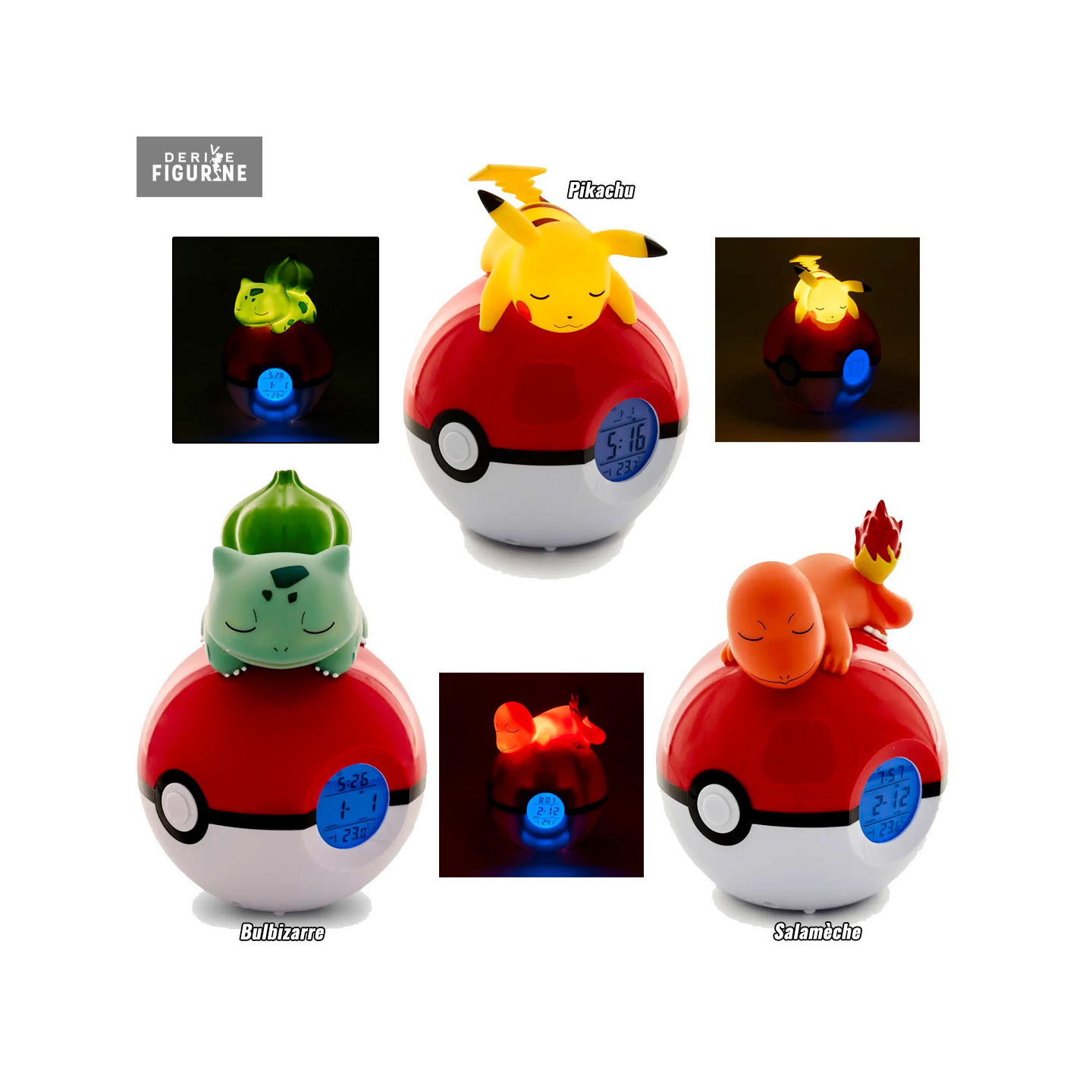 Official alarm clock of your choice between Bulbasaur, Charmander or Pikachu measuring about 18 centimeters high. The manufacturer is Teknofun.